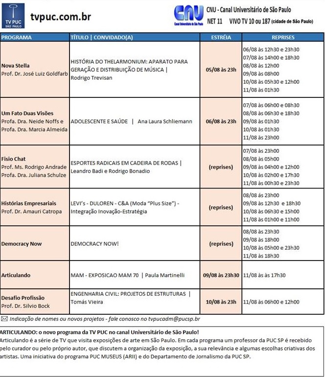 Conheça a programação da TV PUC no Canal Universitário, de 5 a 8/8:
