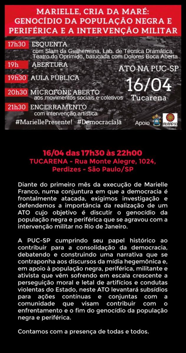 No dia 16/4, um mês após o assassinato da vereadora Marielle Franco, o Tucarena será palco do ato Marielle, cria da Maré. De acordo com a organização, que conta com o apoio da Pró-Reitoria de Cultura e Relações Comunitárias, o evento será realizado para apoiar a população negra, periférica, militante e ativista que vêm sofrendo em escala crescente a perseguição moral e letal de artifícios e condutas violentas do Estado. O ato levantará subsídios para ações contínuas e conjuntas com a comunidade que visam contribuir com o enfrentamento e o fim do genocídio da população negra e periférica.