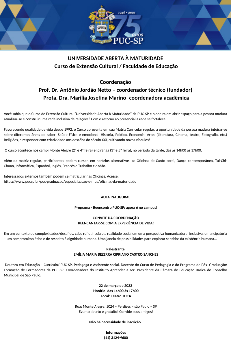 A Universidade Aberta à Maturidade retoma, dia 22/3, às 14h, suas atividades presenciais, depois de dois anos de pandemia da Covid-19. A aula inaugural será no Tuca. Veja a seguir.