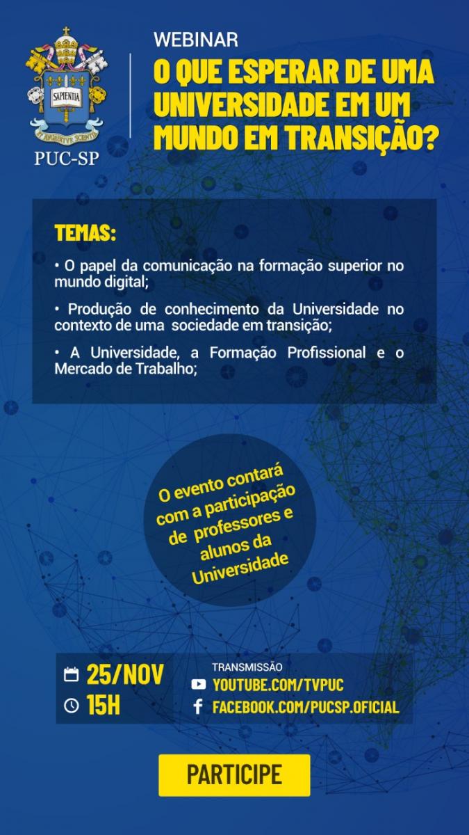 O que esperar de uma universidade em um mundo em transição? é o tema do webinar que a PUC-SP realiza, dia 25/11, às 15h.