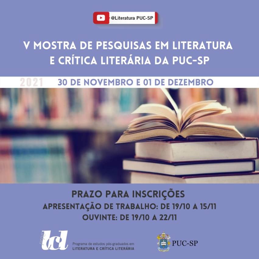 O evento é promovido pelo o Pós em Literatura e Crítica Literária e acontece dias 30/11 e 2/12. Serão aceitos trabalhos de alunos regularmente matriculados em programas de Pós-Graduação stricto sensu em mestrado (acadêmico e profissional) e doutorado e de especialização em Literatura e áreas afins, tanto da PUC-SP como de outras universidades brasileiras.