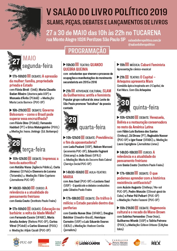 Promovido por um grupo de editoras independentes, em parceria com a PUC-SP, o V Salão do Livro Político se realiza entre 27 e 30/5, no Tucarena.