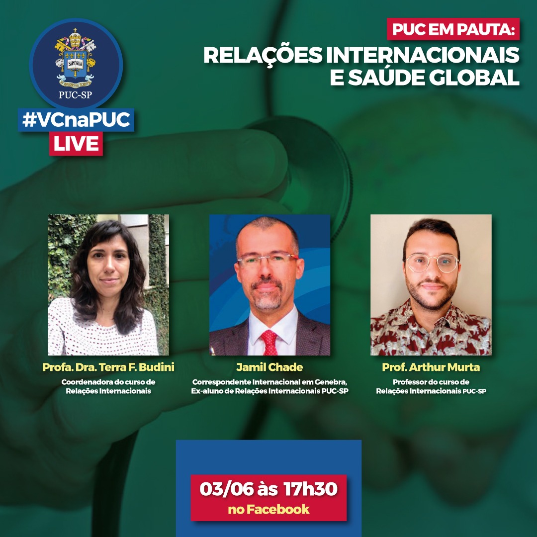 Dias 3/6, sempre às 17h30, o programa VCnaPUC realiza live com o tema Relações Internacionais e Saúde Global.
