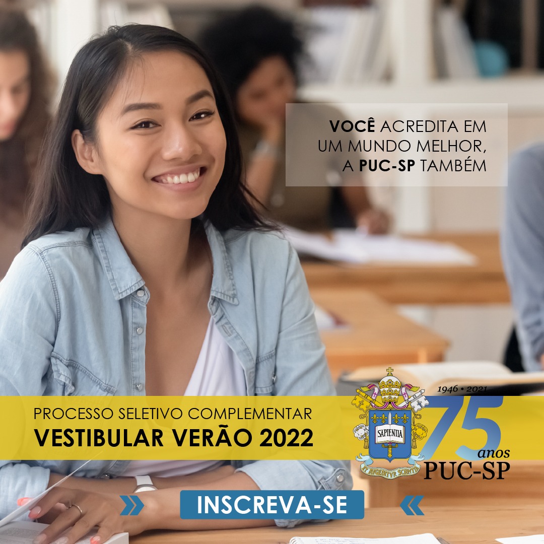 Até 14/2, estão abertas as inscrições para o novo Processo Seletivo Complementar de Verão PUC-SP. A taxa de Inscrição é de R$ 50 e a primeira chamada de aprovados ocorrerá em 23/2.