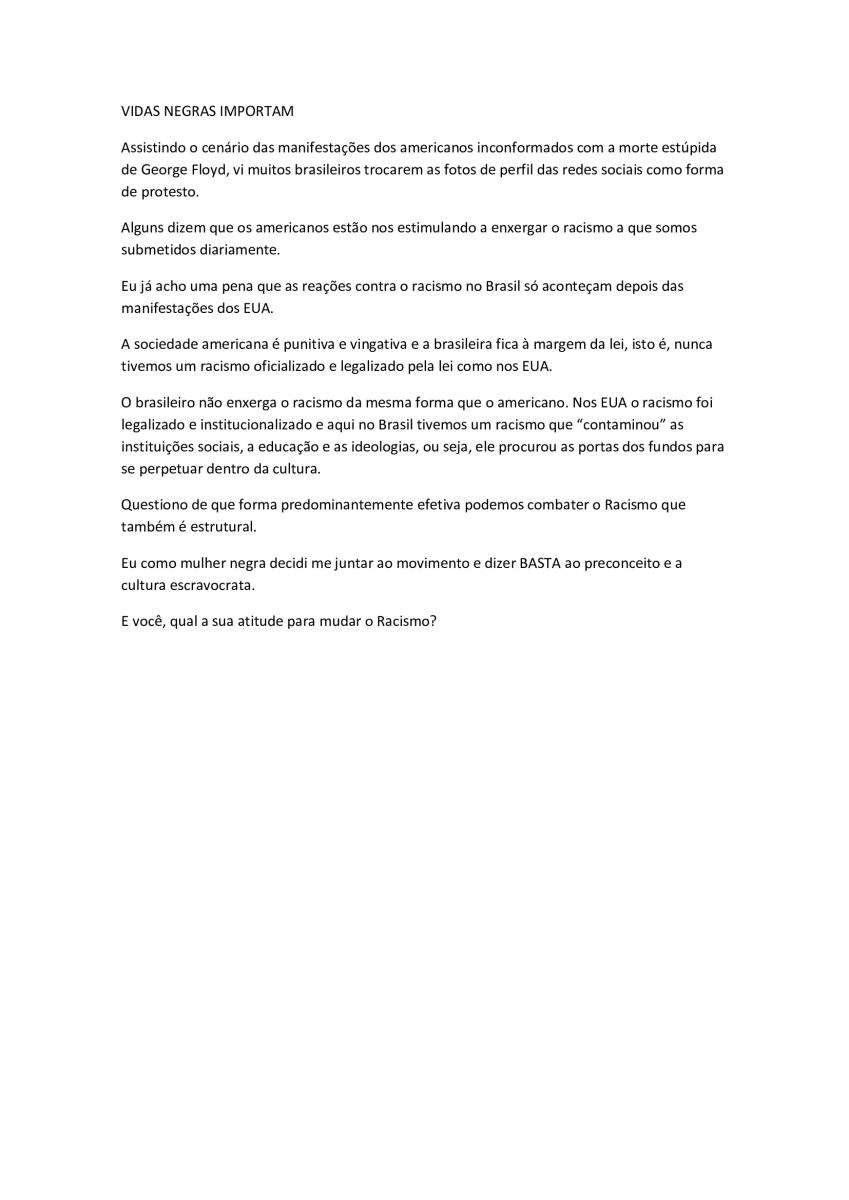 "Eu como mulher negra decidi me juntar ao movimento e dizer BASTA ao preconceito e a cultura escravocrata." Clique aqui para ler a íntegra.