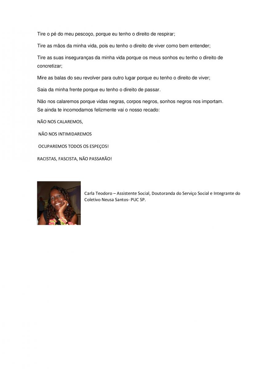 "Não nos calaremos porque vidas negras, corpos negros, sonhos negros nos importam. Se ainda te incomodamos felizmente vai o nosso recado." Clique aqui para ler a íntegra.