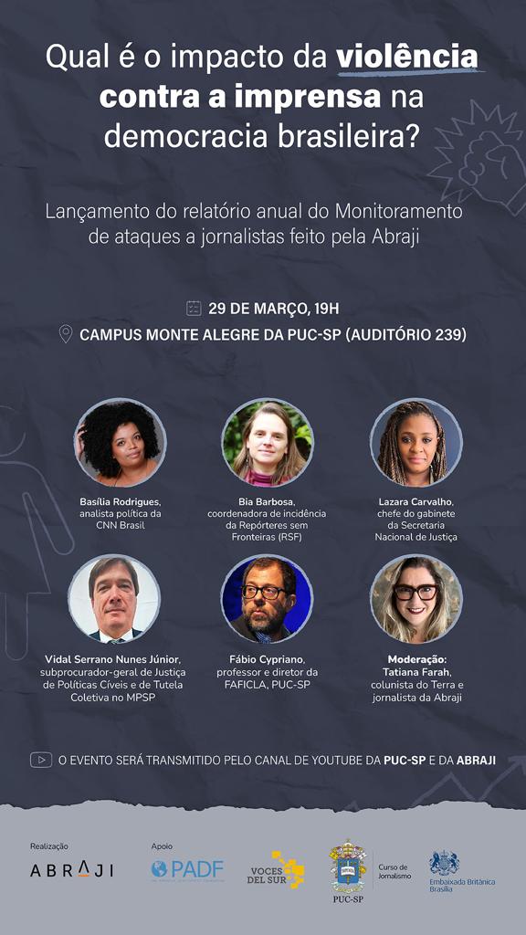 A PUC-SP recebe, dia 29/3, às 19h, debate da Associação Brasileira de Jornalismo Investigativo (Abraji), no qual serão apresentados os dados do Relatório 2022 sobre o Monitoramento da Violência contra Jornalistas no Brasil, feito pela entidade.