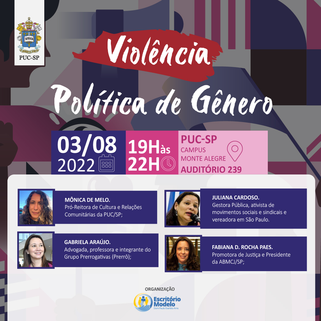 Estão abertas as inscrições para o evento Violência Política de Gênero, que será relizado dia 3/8, às 19h.