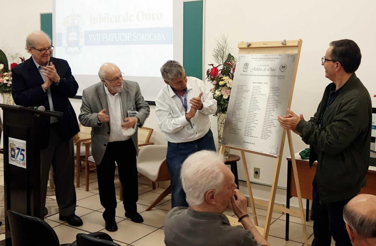 Na manhã de 28/5, alunos da 17ª turma de Medicina da Faculdade de Ciências Médicas e da Saúde (FCMS) se reuniram no campus Sorocaba para comemorar o jubileu de ouro de sua formatura, realizada em 1972. Mais de 50 jubilandos e 60 acompanhantes prestigiaram o evento.