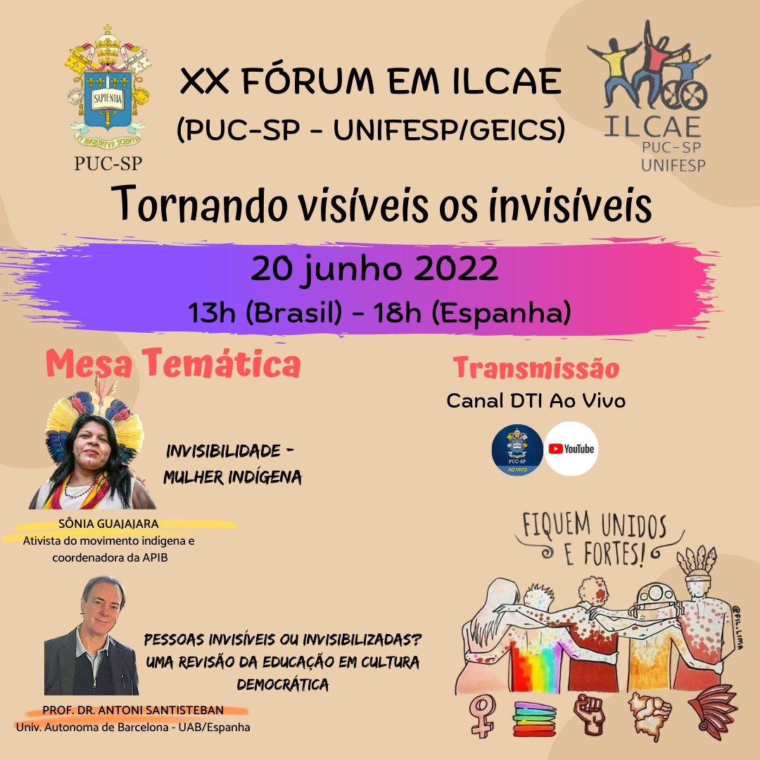 “Tornando visíveis os invisíveis” é o tema da pesquisa da profa. Dra. Angela Lessa, líder do ILCAE, que será debatido por Sonia Guajajara, liderança indígena brasileira, considerada pela revista Time, em 2022, uma das 100 pessoas mais influentes do mundo e que falará sobre Invisibilidade da mulher indígena; Antoni Santisteban, professor de la Universidad Autónoma de Barcelona e coordenador de la Especialidad de Didáctica de las Ciencias Sociales del Máster de Investigación en Educación de la UAB analisará o tema sob a seguinte perspectiva: Pessoas invisiveis ou invisibilizadas? Uma revisão da educação em cultura democrática.